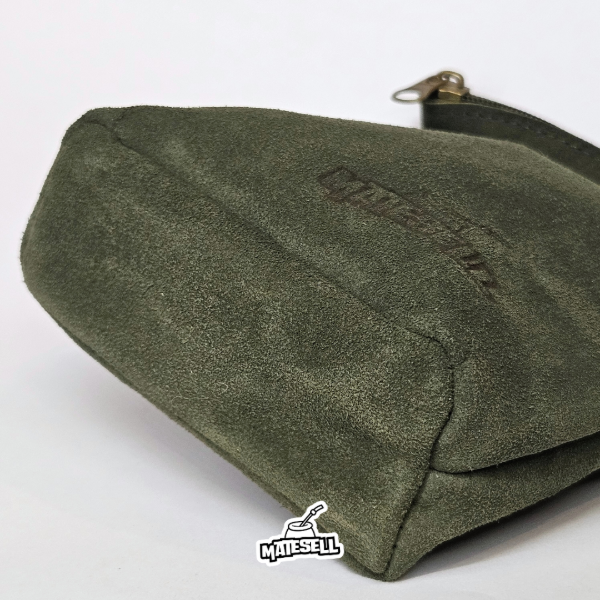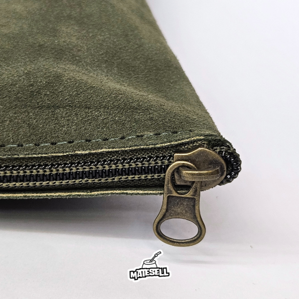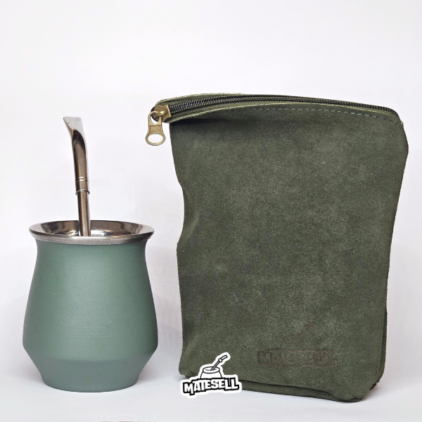 Este yerbero de cuero gamuzado con base color verde oliva combina elegancia, calidad y funcionalidad en un diseño pensado para el uso diario.