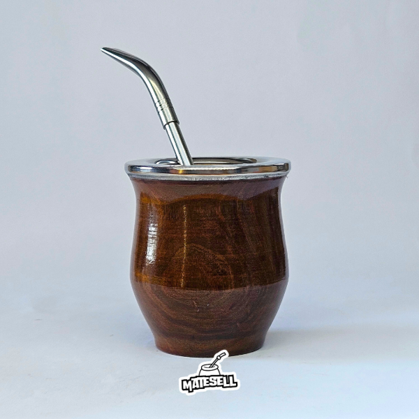 Mate hecho artesanalmente de algarrobo con una virola de acero inoxidable lisa, un diseño clásico y práctico.